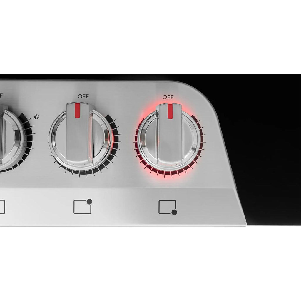 Backlit LED knobs light up when the cooktop is in use.